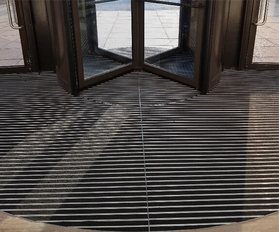 The external half of the revolving door on this job used our MW EXT inserts as this was open to the elements and the rest of the mat used WSE Vulcan.
